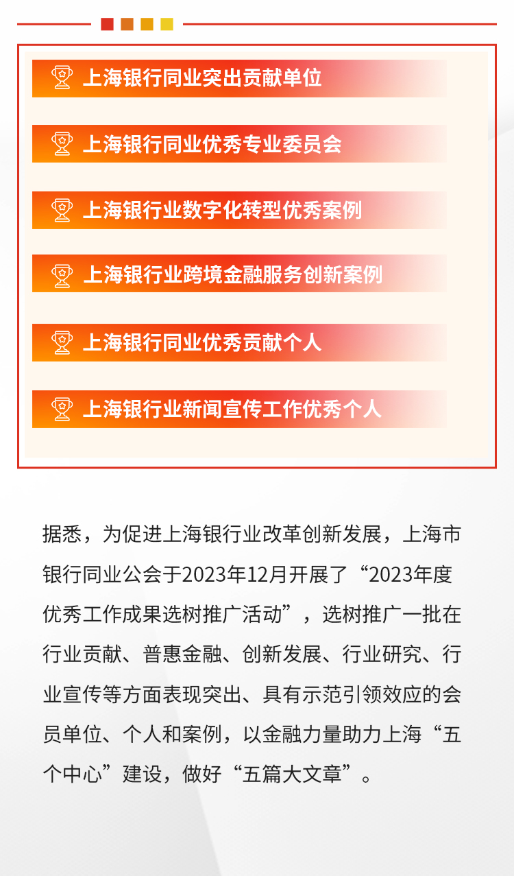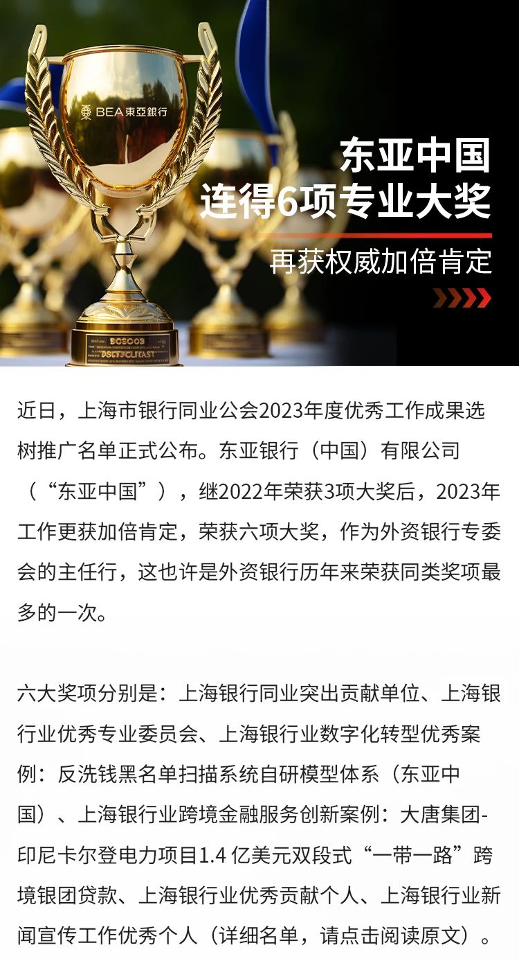 近日,上海市银行同业公会2023年度优秀工作成果选树推广名单正式公布。东亚银行(中国)有限公司(“东亚中国”),继2022年荣获3项大奖后,2023年工作更获加倍肯定,荣获六项大奖,作为外资银行专委会的主任行,这也许是外资银行历年来荣获同类奖项最多的一次。